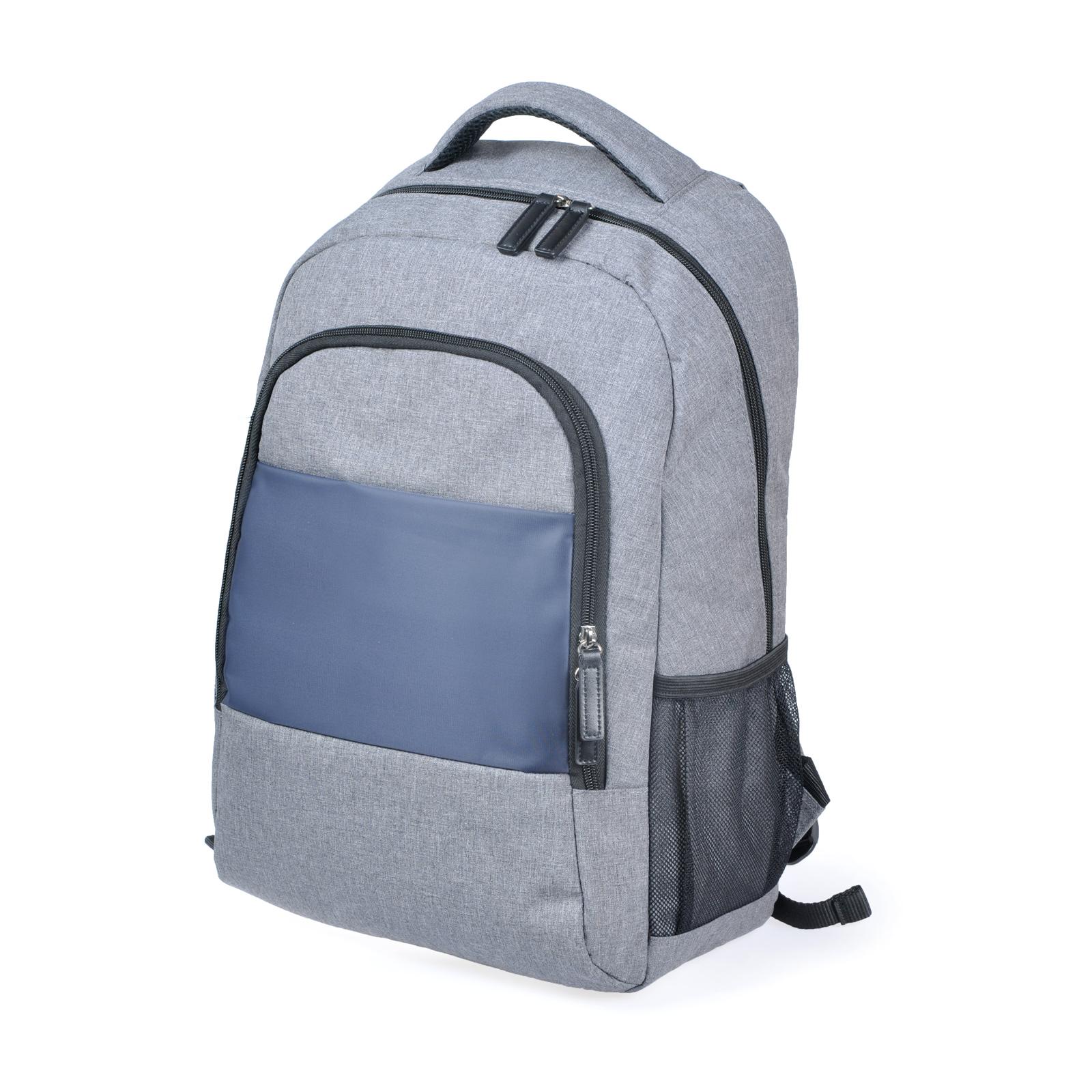 Рюкзак для ноутбука 15''. Має одне велике відділення, з фіксатором для ноутбука, 1 фронтальну кишеню на блискавці та 2 бокові, М'яка спинка, лямки з пасивною системою вентиляції. Ущільнена м'яка підкладка. Розмір синьої вставки: горизонталь - низ 24 см, верх 22 см, вертикаль: 14,4 см. Матеріал: Поліестер під імітацію джута.Розміри друку: